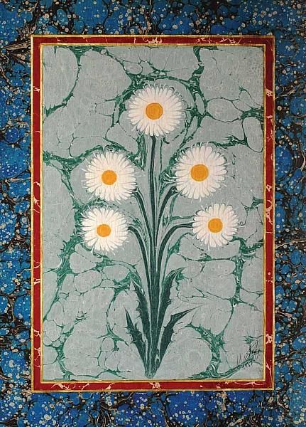 Editor: So, we are looking at "Buket" by Mustafa Duzgunman. It seems to be mixed-media, with tempera and other painting techniques used. The artwork showcases vibrant red and yellow flowers against what looks like marbled paper. It's striking how these floral arrangements stand out against the intricate background, but I can't really tell if they are stenciled in or something else. What do you see in this piece? Curator: This is a fantastic example of Ebru, or Turkish paper marbling. Understanding the history of Ebru as a traditionally secretive art form, heavily guarded by guilds, gives us context. These guilds wielded significant cultural influence, dictating styles, techniques, and even access to materials. Note how the political and social atmosphere of those times, with its strict hierarchical structures, shaped the art. What’s interesting is how the flowers almost defy the fluidity of the marbling, suggesting a tension between control and chance. Editor: Ah, so it's marbling! It seems difficult to get that control on swirling dyes, particularly the way they add these flower shapes in. Were there any power structures involved in this orientalist art, such as, how does the social lens inform its appeal today? Curator: Absolutely! Orientalism, as a lens, frames the "East" through Western eyes, often exoticizing or romanticizing it. In the context of Ebru, particularly in its adaptation for the art market, it can be seen as both a preservation and a commodification of cultural heritage. The institutional support, the exhibitions, and the art market, all play a part in shaping our understanding and appreciation of this work. Consider how the absence of specific dating pushes the artwork closer to appealing to a particular audience rather than focusing on the time and technique. Editor: That’s a fascinating perspective. I hadn’t considered the layers of cultural interpretation and institutional framing involved. Curator: Indeed. It prompts us to question how we perceive cultural heritage, whose voices are amplified, and what gets lost or altered in translation. Editor: Thanks, I definitely see this work in a different light now!