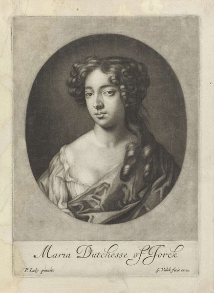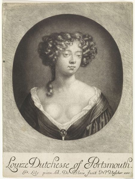This is an anonymous portrait print of Louise de Kéroualle, Duchess of Portsmouth. The most striking aspect is her elaborate hairstyle, cascading in carefully arranged curls. Hairstyles, throughout history, have served as potent symbols of status, identity, and cultural belonging. Consider the elaborate wigs of the French court, or even the carefully constructed styles seen in ancient Roman portraiture. The act of adorning one's hair carries a psychological weight, a visible assertion of self. The cascade of curls, not unlike the flowing locks of mythological figures, evokes a sense of vitality and perhaps even untamed energy. Yet, the meticulous arrangement speaks of control and artifice. This tension embodies the complex dance between nature and culture, echoing through different eras and resurfacing time and again in the visual arts. A potent symbol, indeed.