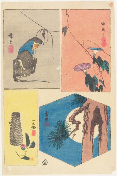 This is a page from "Moyō hinagata miyako no nishiki," a textile pattern book made by Kichirobe Yamanaka. These designs for kimonos are printed with woodblocks, a process that demands meticulous carving and registration to achieve the crisp lines and vibrant colors that you see here. Consider the context of production. Woodblock printing in Japan was an established industry by this time, involving designers, carvers, printers, and publishers. These books played a key role in shaping popular taste and driving the demand for luxury goods like kimonos. Notice how the designs integrate natural motifs – flowers, streams, and landscapes – into the very structure of the garment. The patterns aren't just applied to the surface; they become part of the kimono's identity. This reflects a deep cultural connection to nature and an appreciation for the skilled labor required to produce such intricate designs. By understanding the materials, the making process, and its cultural significance, we gain a richer appreciation for this beautiful object, and how design permeates everyday life.