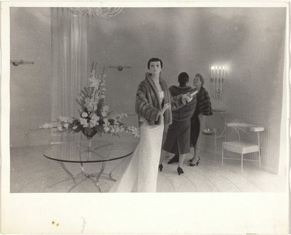 Curator: Robert Frank’s gelatin silver print, “Dress Shop – Los Angeles,” taken in 1956. It strikes me as an almost cruelly observed tableau of mid-century aspiration. What’s your first take? Editor: Bleak opulence, almost sterile. The way the woman’s fur stole seems to blend with the minimalist interior… it's unnerving. She’s positioned like one of the mannequins. Curator: It’s Frank’s subversion of the American Dream narrative, certainly. On the surface, we have all the trappings of wealth – fur, the chandelier, the large showroom – yet the mood is hollow, isn't it? The social commentary is what draws me. This image comes from "The Americans", which at the time challenged the self-image of a prosperous, post-war society. Editor: I find her gaze so fascinating. A mixture of suspicion and yearning, directed somewhere outside the frame, outside of her reach. The hat, the pearl necklace… classic status symbols. They point towards an entrenched iconography. What do these objects *mean* to her, and to us, decades later? The very title, "Dress Shop," reinforces its archetypal nature, doesn’t it? This isn't *a* dress shop; it's *the* dress shop. Curator: Precisely! It reflects Frank’s outsider perspective; he wasn’t born into this aspirational culture. The mannequins become symbols, too, for how women were manufactured in that era, ideals impossible to reach. Frank photographed the un-picturesque, highlighting a dissonance within American life. It made his work rather controversial at the time, seen as anti-American, in a sense. Editor: There's a sadness I keep returning to. The arrangement almost resembles a funerary setup— the flower arrangement is particularly mournful. Are we mourning something, or foreseeing something? The loss of individuality within mass consumption? Curator: Perhaps both. Frank was exceptional at distilling complex socio-political anxieties into single, potent images. Editor: Yes, images ripe with symbols we're still unpacking. I wonder how people will decode it in another sixty years? Curator: A question Frank undoubtedly wanted us to ponder. The beauty and burden of imagery.