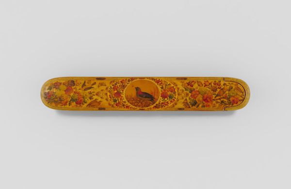 Curator: At the Harvard Art Museums, we have a delightful pen box titled "Pen Box with European Women and Birds in a Landscape" crafted by Lutf-'Ali Shirazi. Editor: It’s charming. At first glance, the figures appear doll-like, almost staged within the landscape. Curator: Exactly! These aren't just any figures; the presence of European women within a Persianate artwork speaks volumes about cross-cultural encounters and artistic exchange. Editor: How so? Are these women symbolic of trade, or perhaps diplomatic ties? The birds too—do they carry a specific cultural meaning? Curator: The birds, common in Persian art, often represent the soul, or even spiritual aspirations. The women are more complex, likely reflecting a fascination with the West during a period of increasing interaction. Editor: It's a fascinating glimpse into a world grappling with outside influence and incorporating it into existing visual languages. Curator: Indeed, a testament to the power of art to reflect, absorb, and transform cultural narratives. Editor: Well, it certainly gives one a lot to think about.