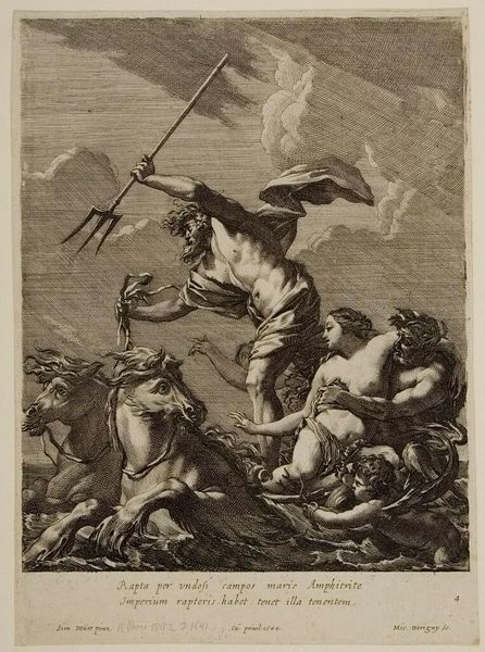 Curator: Oh my! The drama! Looking at this print, I feel swept away…literally. Editor: Indeed! This is Jean Audran's "The Centaur Nessus Carries Off Deianira," now residing at the Harvard Art Museums. It captures a pivotal scene from mythology. Curator: The swirling drapery, the desperate reaching…it’s all so wonderfully theatrical. But the centaur's face seems almost…exultant? It’s unsettling. Editor: That's the tension Audran so brilliantly captures. It's a tale of betrayal, violence, and the abuse of power, filtered through a baroque lens. Nessus was tasked to ferry Deianira across the river but decided to carry her away, prompting Hercules to shoot him with a poisoned arrow. Curator: It’s a potent reminder that behind grand gestures and flowing lines, there's often a darker narrative simmering. Editor: Precisely! The artwork reminds us that historical pieces are never just about what is shown but about understanding the social and ethical narratives of their time. Curator: It makes you consider: who truly benefits from these dramatic displays? Editor: An important reflection, indeed.