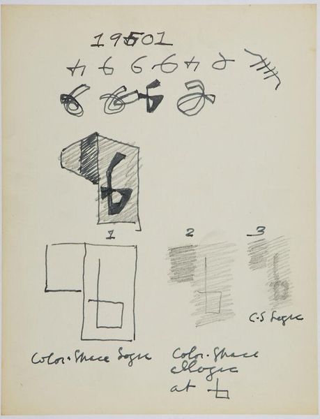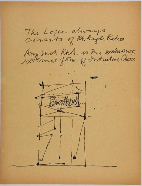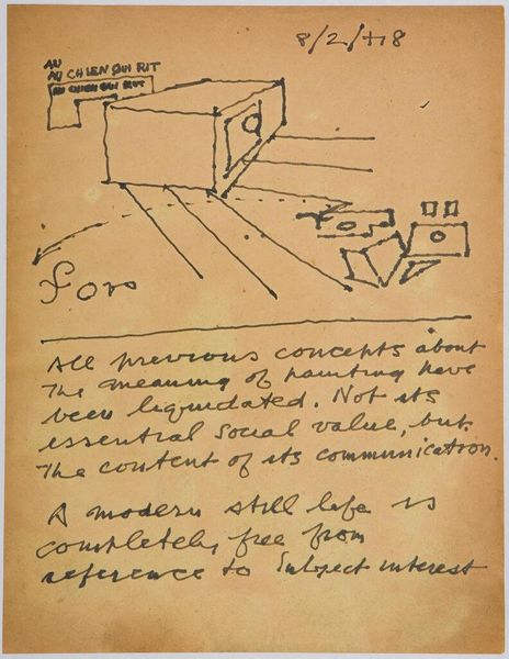 Curator: This is Stuart Davis’s “Art Theory Text with Table,” a quick sketch presenting his thoughts on the creative process. Editor: My first impression is one of playful deconstruction. It appears like an attempt to distill an object to its barest, most evocative lines. Curator: Davis, known for blending abstraction with American themes, seems to suggest here that art isn’t about replication but about transformation. He focuses on a subject and turns it into art. Editor: The table form, though simple, feels like a grounding symbol, a reference to domesticity perhaps, or stability. But Davis destabilizes this via abstraction. Curator: Perhaps his choice reflects a broader dialogue about the role of functional objects and everyday life in shaping art's purpose and accessibility. Editor: Ultimately, Davis shows us how even mundane imagery can possess layers of complexity and carry profound meaning.