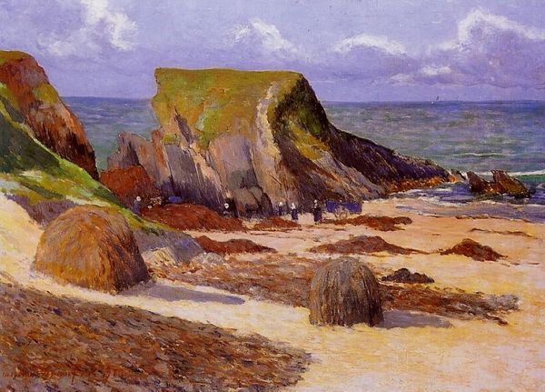 Maxime Maufra's "The Beach at Morgat, Finistere" captures a serene coastal scene with an emphasis on light and atmosphere. Notice how the composition is structured around a prominent cliff formation to the left, balancing the open expanse of the beach and sea to the right. The colour palette is restrained, dominated by soft blues, greens, and sandy browns, creating a tranquil mood. Maufra uses visible brushstrokes to build up the forms, giving the painting a sense of immediacy. The interplay of light and shadow across the landscape reflects an interest in capturing fleeting atmospheric conditions. The textures of the rocks, sand, and water are suggested through variations in brushwork and colour, but the painting remains grounded in visual sensation and the materiality of paint. Consider how this approach aligns with broader Impressionist concerns around perception and the representation of nature. The formal qualities of colour, texture and composition work together to evoke a sense of place, but also to explore the act of seeing itself. Ultimately, the artwork functions as a site where aesthetic experience and the exploration of visual language converge.