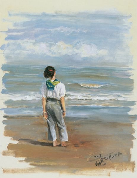 Editor: Bo Bartlett's "The Watercolorist," created in 2011, presents a lone figure overlooking the sea. The artist's contemplative pose and the vastness of the ocean evoke a sense of solitude and introspection. What strikes me most is how the figure, turned away from us, almost invites us to consider what he’s thinking, to project our own thoughts onto the scene. What do you make of this work? Curator: That solitary figure certainly prompts reflection. Notice how the composition positions him – perched between earth and water, self and infinity. He becomes a vessel, a focal point through which we can access a much older symbolic dialogue between humankind and nature. Editor: A dialogue? Curator: Indeed. Water, the source of life and chaos, often represents the subconscious. He isn’t just observing; he’s engaging with deep-seated cultural symbols. His posture, though relaxed, contains a certain tension. The bright hat and scarlet cloth add an intriguing touch. What memories do those colors evoke? Editor: Warmth, perhaps? Like embers of a fire, in contrast to the cool blues of the ocean? The man himself is a fascinating cultural reference; he is a bit of a throwback, and seems to belong to another time, like the character in a movie or painting. Curator: Exactly. Consider the historical depiction of artists by the sea – Friedrich's "Monk by the Sea," for example. The visual rhyme isn't accidental; this work is speaking to a history of such imagery. The “watercolorist” seems removed from the modern world, rooted instead in tradition and contemplation. Don't you find the use of his back creates more room for the viewer? Editor: It certainly does. I hadn't considered how Bartlett consciously engages with art history here. It adds so much more depth to what initially seemed like a straightforward plein-air scene. Thank you for illuminating the deeper symbolism within the work. Curator: And thank you. Recognizing recurring visual patterns enhances our understanding of continuity across generations. Every image carries echoes, waiting to be heard.