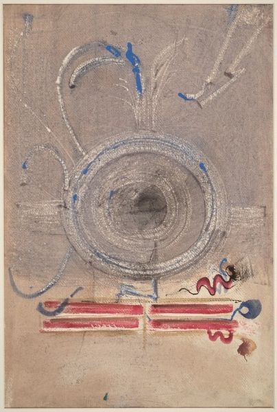Curator: Mark Rothko's *Untitled [verso]*, made with watercolor, dates from around 1944 to 1946. Editor: There's a definite somber mood here, a kind of aquatic gloom with these ambiguous forms suspended in it. The gray watercolor wash sets the stage. Curator: These shapes are characteristic of Rothko’s move into biomorphic abstraction, the phase preceding his signature blocks of color. It calls up imagery from his past, influenced by mythological themes as well as experiences related to emigration. Do you get any such associations? Editor: Associations are tricky. However, I’m interested in how Rothko is employing the drawn line here. Note the way he uses contrasting blue and red to energize what is actually a very tight compositional field, bisected horizontally and filled with quasi-organic motifs. The shapes feel almost embryonic. Curator: That tight field also gives us the sensation of claustrophobia, echoing the feelings that his family was feeling with so much discrimination happening in the world and Rothko's fleeing from Russia. And the vertical emphasis reinforces our connection to these emotional forms. I sense primal imagery as well; something timeless. Editor: Perhaps, but those floating calligraphic forms owe quite a debt to European Modernism—the automatic writing of the Surrealists and Miró in particular. The palette here may feel grounded, but look at the confident draftsmanship. The lines move freely across the support. Rothko lets the watery medium do so much of the talking, creating transparency where forms overlap. Curator: Precisely! We are peering beneath surfaces into other states. Those seemingly spontaneous lines are actually highly evocative. They serve as vestiges of memory. Consider that single bar across the pictorial space as representative of an emotional blockage, like a dam ready to burst. Editor: Well, considering it now, the picture plane works as a conceptual space where Rothko explores the very essence of abstract forms—that space becomes his theatre of forms. It offers a vital glimpse into Rothko’s visual thinking before he moves on to those familiar expanses of pure color. Curator: Absolutely, seeing it this way helps appreciate Rothko’s vocabulary—how line, form, and symbolism can articulate human experience so effectively. Editor: It's certainly taught me to view Rothko's mature works from an alternate perspective, considering these emerging arrangements of form and line within abstraction's evolving syntax.