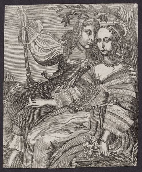 Editor: So, this is "Gezicht," a print made by Cornelis Boel, sometime between 1590 and 1621, and currently residing at the Rijksmuseum. I am immediately drawn to the textural contrast—the smooth skin against the elaborate ruff and the intricate detail in the fabric. What do you see in the work from a formalist perspective? Curator: Precisely. Observe how the composition is structured: the figures are arranged to guide the viewer’s eye through a hierarchy of details. The bright background to the left of the lady's reflection in the mirror serves as a vanishing point, from which lines of perspective radiate. The artist uses contrasts in shading to enhance dimensionality. Note the precise linework; it's particularly effective in creating varied textures in the clothing. How does the meticulous nature of the engraving influence your perception of its meaning? Editor: It makes me think about the deliberate nature of beauty and its construction. Every detail seems so carefully placed, suggesting a commentary on vanity. But is it purely a visual exercise, or are there social commentaries in play here? Curator: The artist utilises meticulous control over line and tone, rendering the human form and textile textures with an acute awareness of structure and form. Can we ignore the presence of symbolic structures which organise it? Note, for instance, that Latin sentence which closes the picture; do you think that the presence of this text enhances or degrades the form? Editor: That's a good question. Considering its influence, I would have to say that including it enhances its visual balance. The Latin text helps ground the image. This was an enlightening overview; it allowed me to consider art beyond historical context and see it as an orchestration of formal qualities. Curator: And understanding the deliberate visual decisions allows us to discuss potential symbolic readings while acknowledging that those readings originate within the artwork itself.