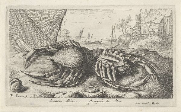 Albert Flamen created this etching titled "Zeekreeft op het strand." Its detailed lines invite a close look at the seemingly mundane subject of a lobster on the beach. The composition is dominated by the oversized lobster in the foreground, immediately distorting our sense of scale. Behind it, Flamen uses linear perspective to depict ships and smaller figures. The contrast is striking: the lobster, rendered with meticulous detail, dwarfs the human activity, creating a surreal, almost dreamlike quality. This play with scale challenges traditional hierarchies within the image, questioning our perception of importance and reality. By magnifying the lobster, Flamen asks us to consider the overlooked details of our environment. What do we value? What do we ignore? The etching's precise lines and careful composition aren't just aesthetic choices. They are tools to question our understanding of space, scale, and the values we assign to the world around us. It's a reminder that art invites us to continually re-evaluate our perspectives.