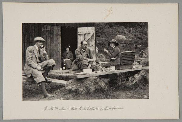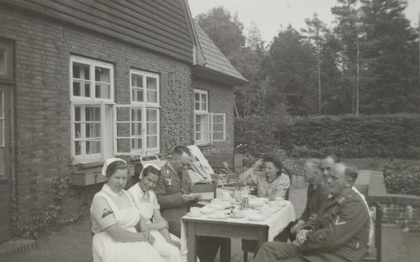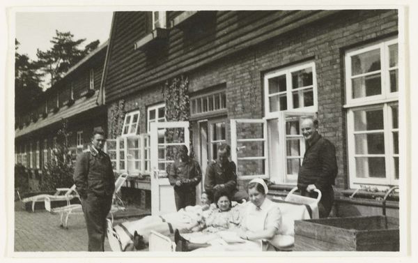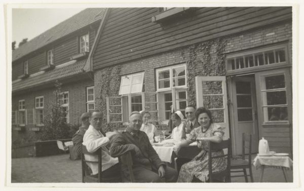 Curator: This gelatin silver print from the Rijksmuseum's collection presents a gathering of German Luftwaffe military personnel, outdoors, seemingly relaxed at a table. It’s tentatively dated to sometime between 1940 and 1945. Editor: It has an uncanny ordinariness. Seeing them grouped like this, at ease, on what looks like a summer afternoon... it's chilling precisely because it clashes so violently with what we know about that era. Curator: The banality of evil, maybe? I keep thinking about that phrase when I see this kind of image. This image is tagged as an archive photograph in the style of group portrait, but I’m interested in how that relates to the visual codes it's deploying. The light, the table setting. It almost feels staged. Editor: Definitely staged. There’s a consciousness of being recorded, a performative aspect, that shapes the composition. I see in the background a beautiful countryside house—brick walls covered with ivy. I feel there’s almost an appeal here, and perhaps the photo was meant to instill something of what they were trying to build in their image. The immaculate table, and even the faces that aren’t smiling. There's a deliberate…severity. Curator: It almost reads like a twisted version of a family gathering, which plays into the unsettling familiarity. The setting, a sunny garden, a house consumed with the wild ivy—it all suggests continuity, belonging. Editor: I wonder, though, about the individuals. There’s one woman amongst them. The power dynamics in play are almost suffocating—like they carry a heavy weight of some sort of symbolism. How each of these individuals negotiated the space they were claiming, or not claiming... it almost brings on a kind of melancholia. They appear trapped. Curator: Trapped in a history they helped create. Photography captures a moment but becomes a historical document and symbol over time. What a chilling effect it can produce on us. Editor: Indeed. What's left isn’t only an image but the haunting echo of choices made, caught in time.