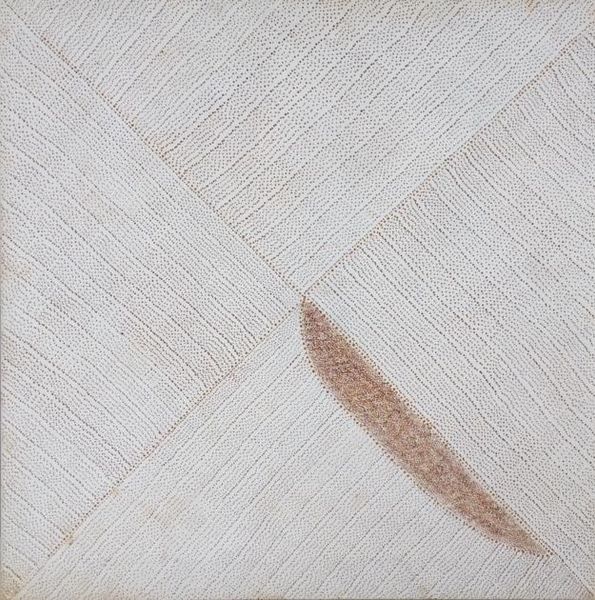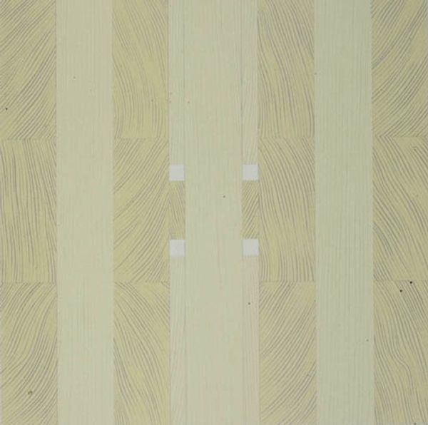 Curator: It's so subtle! Looking at "Karnac I" by Tony DeLap, completed in 1972 using acrylic paint, I'm immediately drawn into its quiet, almost meditative state. It’s so pale—what do you think? Editor: Well, "quiet" is one word for it. To me, the horizontal stripes and the slightly off-kilter geometric shapes almost feel like a visual representation of institutional power—the rigid structures and the barely perceptible manipulations that uphold them. Curator: Institutional power? Hmm, that's not what I got from it at all. It felt more like a…dreamy landscape. Almost like a sandy beach right at the edge of where land dissolves into sky. Editor: Interesting! But consider the context of the early '70s. Minimalism and hard-edge painting were emerging partly as a reaction against the perceived excesses and subjectivities of previous movements. DeLap, with this rigorous geometry, might be seen to be stripping away sentimentality to expose a kind of fundamental order – or the *illusion* of it. The creamy colours feel, perhaps, almost like faded paper. What histories have gone unwritten on these strips? Curator: Okay, I can see the faded aspect, the almost lost feeling, I feel that... perhaps that adds to that quiet sensation? Like echoes of things. Still, though, it almost glows to me. Do you think that white square adds a note of…I don't know, spiritual intervention? It almost stops me in my tracks Editor: Or does it highlight the constructed nature of the entire composition? The "intervention," as you put it, reads to me as a deliberate act of disruption— a break in the pattern that forces us to acknowledge the underlying artifice of it all. It screams "pay attention to the structures." The whole idea feels relevant in light of present-day injustices! Curator: Mmm. Still makes me feel like I'm watching a sunset… a sunset with a point to make about societal hierarchies, maybe! Editor: Perhaps that's the power of it—DeLap’s ability to provoke multiple interpretations, to be both formally engaging and quietly subversive. A beach as seen through a veil of systemic critique. Curator: Yeah, or vice versa! Thank you; my beach vision needed some disrupting today! Editor: My pleasure; and hopefully that’s something listeners will appreciate as well: art being inherently open to dialogue and reinterpretation, right?