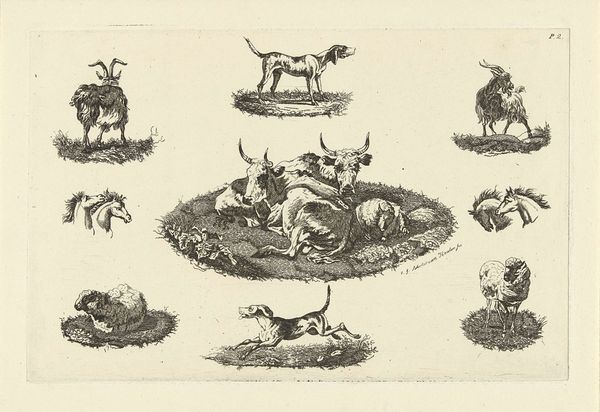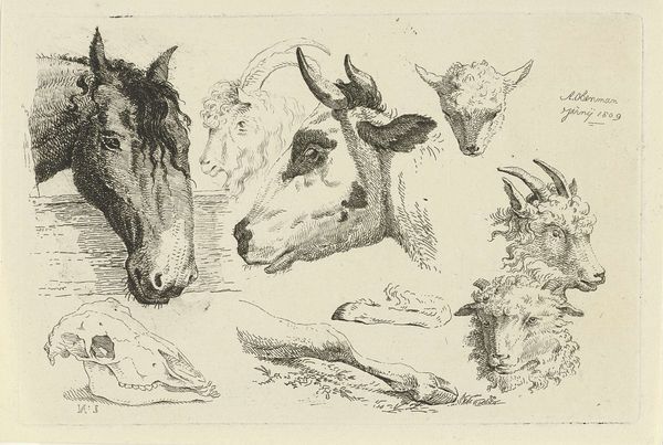 Editor: Here we have “Three Goats Surrounded by Heads of Cows and Donkeys," made sometime between 1821 and 1869 by Christiaan Godfried Schutze van Houten. It looks like a pen-and-ink sketch. It feels very...folksy, in a way. What stands out to you when you look at this work? Curator: I see a glimpse into the artist’s inner world. This drawing reads as a kind of personal bestiary, a gathering of animal symbols loaded with cultural weight. Consider the goat: historically linked to both virility and stubbornness, often used as a scapegoat in various mythologies. And the surrounding heads – the bovine, suggestive of plenty and groundedness, juxtaposed with the donkey, a symbol of humility and, perhaps unfairly, foolishness. Editor: So you're saying the artist chose these specific animals deliberately? Curator: I believe so. The assembly isn't random. It feels like the artist is working through a set of characteristics, perhaps even wrestling with aspects of themselves or others in their life. What story might the artist be trying to tell us with these contrasting symbols? Editor: Maybe it is the artist representing different human qualities that can co-exist in a community, or maybe even within a single person? There’s a kind of innocent strangeness to the image that really gets me thinking. Curator: Indeed! These archetypal symbols persist across time and culture, reflecting the ongoing human fascination with self-understanding. And in sketching them, Van Houten engages with that same, ancient tradition. A humble sketch, yet potent with meaning. Editor: I hadn’t considered the deeper symbolic meaning until you pointed it out. Now I see so much more! Thanks for sharing that insight!