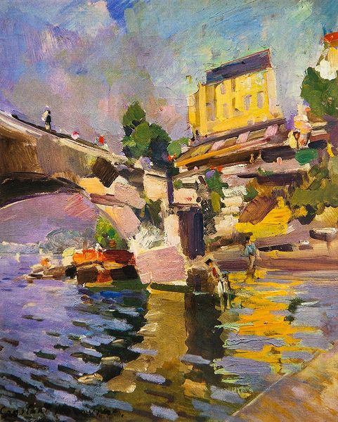 Editor: John Michael Carter's "Tallow, Ireland," an oil painting capturing a cityscape in an impressionistic style, immediately struck me. The water and bridge reflections are so inviting. How would you interpret this piece, especially thinking about its setting in Ireland? Curator: It’s interesting to consider this work within the history of landscape painting in Ireland. Artists often engaged with landscape to portray a specific socio-political image, especially under British rule. Does this painting reflect or resist such a legacy? Editor: I'm not sure, can you expand on the socio-political angle in more detail? Curator: Consider the artistic movements that portrayed the Irish landscape as either romanticized or desolate, often tied to political agendas. The very act of painting ‘en plein air,’ as this one appears to be, places the artist in a direct relationship with the environment. It asks questions. Was he commissioned? And by whom? Or does it embrace pure aesthetic experience? Editor: The focus seems to be on capturing a serene scene; the steeple provides a historical and religious context to it too. Would you say Carter is deliberately avoiding those earlier loaded representations? Curator: Possibly, or he may be engaging with a different kind of dialogue about contemporary Ireland, one focused on its quiet beauty rather than historical struggles. Do you notice how the bridge serves as both a physical structure and a visual anchor for the entire scene? Editor: Yes, it divides the scene horizontally and anchors the skyline vertically. I initially responded to the play of light, but thinking of your questions, I see the setting carries cultural significance. Thank you! Curator: And thank you; considering these visual details while keeping the social implications in mind really shapes the narrative of landscape paintings and the power behind public perception.