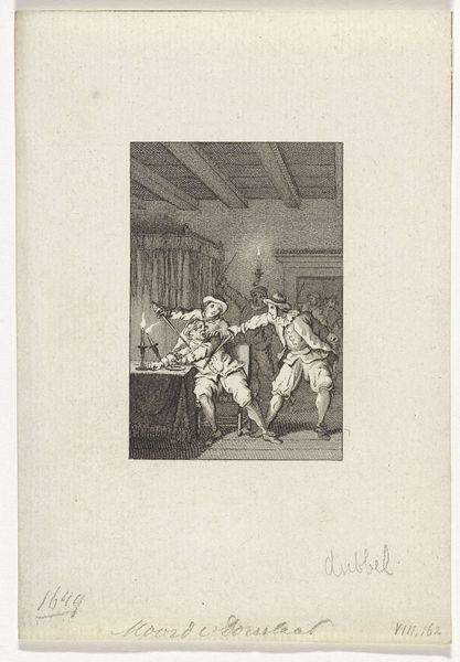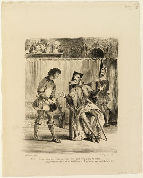 Curator: The atmosphere is quite heavy, don't you think? There's a stillness in the poses and the way the figures seem enclosed, despite the presence of three individuals. Editor: This lithograph by Eugène Delacroix, titled *Weislingen Held Prisoner by Goetz*, was created around 1821, and as the title suggests, portrays a scene of imprisonment. Notice the use of ink on paper—a medium often associated with accessibility, due to the comparatively low cost. Curator: Accessibility? How does that tie into the Romantic style? Delacroix usually depicts grand narratives, yet here, we have what seems like a quiet moment. Is he critiquing heroism? Editor: Perhaps not critiquing it directly, but certainly deconstructing the very idea. Think about who these "heroes" really are: they are products of their time, shaped by systems of power and inequality. A materialist reading might note that even a Romantic hero is a commodity produced within a specific social and economic structure. This lithograph served as reproducible, distributed work to disseminate this story and vision. Curator: Interesting. You know, when I look at the process here, particularly the way the light catches on the fabric, I am drawn to Delacroix's deliberate choices with the ink washes. You can almost feel the weight and texture of the material in his rendering of the prisoner's clothing, which contrast sharply with that standing figure on the right. Editor: That standing figure might symbolize the female figure's limited role in a patriarchal society. Confined to a domestic space, observe her subdued expression, and her distance from the two men who seemingly command this situation. Curator: A reminder, too, of the domestic labor involved in keeping prisoners—sewing clothes and cleaning linens. The work to keep the whole machine of the imprisonment running, in more ways than one. Editor: Precisely! The prison's literal confinement and social captivity extends to other people, not just those we'd deem incarcerated. It offers a glimpse into how Romanticism, when viewed through a critical lens, can expose hidden social dynamics. Curator: I do enjoy that he still leaves a rough quality, doesn't clean up every preliminary mark? The marks at the right give an interesting transparency into process. So, looking beyond the apparent stoicism and masculine ideals, this print may be much more multifaceted and, well, maybe less "heroic" than it initially appears. Editor: A nuanced narrative of imprisonment and social confines, visualized with compelling texture. It really shows the many ways artwork can prompt deeper thought about power, access, and how materials circulate.