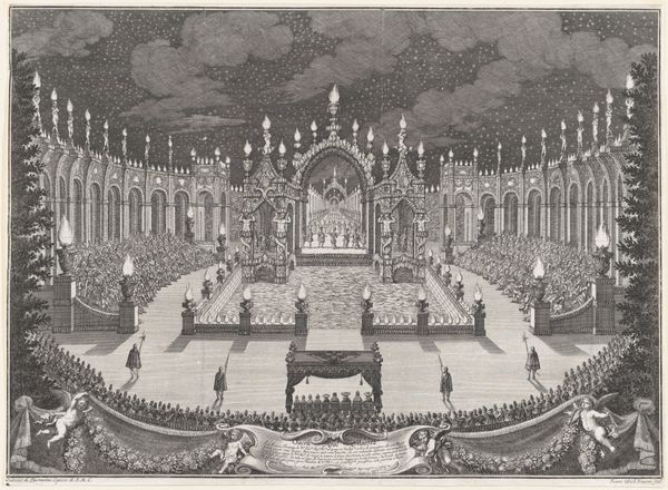 Curator: Standing before us, we have "Christiansborg Slotskapel med Frederik V.s katafalk," a detailed rendering, an etching by Nicolas-Henri Jardin from 1766, presently held in the collection of the Statens Museum for Kunst. The work presents an elaborate state funeral. What springs to mind when you first look at it? Editor: Honestly? That pyramid. I mean, beyond the expected opulence of a royal ceremony, this overwhelming pyramid dominates the space. It is quite the statement piece. It’s a very precise and formal kind of sadness depicted here, isn't it? Curator: The pyramid as a symbol! Its usage in Baroque art serves as both an ancient reference and, potentially, a visual metaphor for stability and eternal life, wouldn't you say? Consider the architectural precision of the piece too, with the symmetry emphasized by Jardin's careful draftsmanship. It lends the whole scene a sense of frozen grandeur. Editor: Definitely a frozen grandeur. The composition makes use of symbols within symbols. The light emanating from within the pyramid, juxtaposed with the somber figures below, tells a clear story, a symbolic passing, almost as if visually echoing concepts of rebirth or ascension... though the mourners remain fixed to their grief. Are there any other peculiar things in the print to examine closer? Curator: Notice the intricate ceiling fresco rendered as meticulously as the architecture below, heavenly host overlooking earthly mourning, reflecting how baroque loved dramatic, contrasting ideas. Editor: And the way the architectural lines all converge, forcing our eyes upwards... fascinating how architecture and set design were employed to project very specific cultural and political narratives. It is as if the print immortalizes a carefully performed ritual. Curator: A carefully staged performance, precisely. And through Jardin's rendering, that performance becomes a historical document. What will resonate, perhaps, with our contemporary viewer about it? Editor: Perhaps it's that strange mix of over-the-top pomp and profoundly personal grief. Both eternally relevant, wouldn't you agree?