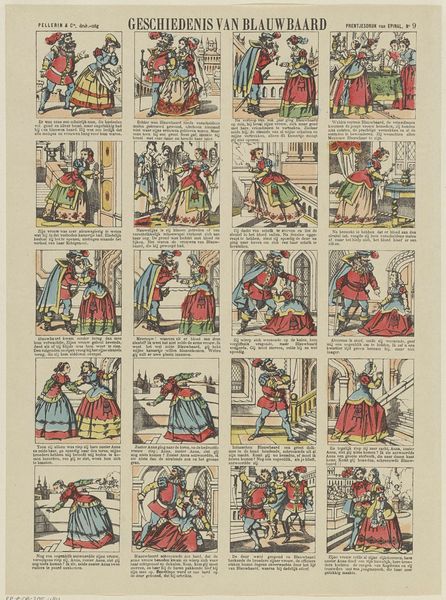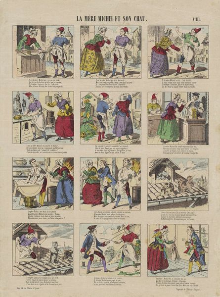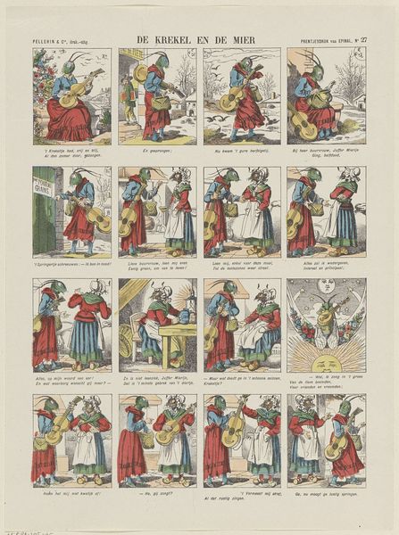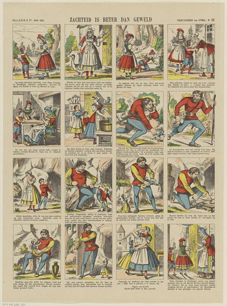 Editor: This print, entitled "Geschiedenis van den verloren zoon," or "History of the Prodigal Son," is attributed to A. Jacobs and was created sometime between 1840 and 1868. It's a lithograph that uses narrative art to convey its message, sort of like a comic strip. I notice it uses bright colors but there is also something a bit crude about the drawing. How would you interpret this work in light of its history? Curator: Well, that "crudeness," as you call it, is part and parcel of its intended audience. These “kinderprenten,” or children's prints, served a crucial role in the 19th century. This lithograph’s simple composition and narrative clarity ensured the story was accessible and memorable. It uses easily recognizable visual cues, even across social classes. Editor: So it’s more than just decorative? It actually had a social function? Curator: Absolutely. These prints democratized art and moral lessons, making them available to the less privileged in society. Its creation and distribution shaped the very idea of childhood. Think about the implications: standardization of art for children becomes tied to an idea of homogenous moral values. Who gets to decide what values are presented and how? Editor: I hadn’t considered that. It is definitely more than just a pretty picture. So it seems to shape behaviour. But also shape our cultural memory. Curator: Precisely. By looking at it in the social context, we can learn more than just the tale of the prodigal son. The role it played in Dutch society underscores the museum's responsibility in interpreting and preserving artifacts. Editor: Thanks, seeing this print in that social light really helped clarify not just its visual appeal but its role in shaping Dutch society’s understanding of morals and art. Curator: My pleasure. It reminds us of the often overlooked ways art actively participated in everyday lives.