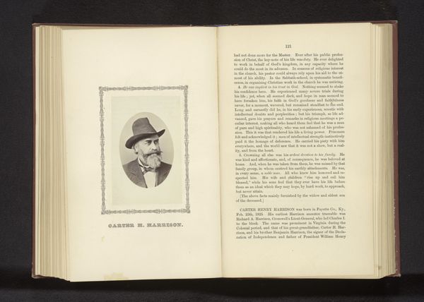 Curator: This is an albumen print depicting Henry B. Carrington. It appears to date from before 1881, judging by the inscription and photographic style. The portrait, framed within a decorative border, presents a stern, uniformed figure. What strikes you first about it? Editor: My immediate impression is the weight of historical context bearing down. That formal pose, the meticulous military garb...it speaks of power, of a certain rigidity. The dark tones and the oval frame contribute to this sense of bygone era, heavy with social expectations. Curator: Absolutely. The albumen print itself is fascinating. It’s a process involving coating paper with egg white to create a smooth surface for the silver salts. It allows for a very detailed image, almost painterly in its effect here. Consider the labor involved: the preparation of the paper, the meticulous printing, the fixing and washing, not to mention the book-binding. The physical object speaks volumes about the means of photographic production at that time. Editor: Precisely, and we can't separate that materiality from the social conditions. This isn't just any soldier. Carrington was involved in violent displacement of Native Americans in the West. Viewing it today demands an awareness of those power dynamics and histories of violence which produced a subject with the status and means for formal portraiture. How do we contend with the image as historical document and propaganda? Curator: That's the challenge, isn't it? Understanding the confluence of technology, labor, and socio-political context that brought this image into being. The academic style in this photograph adheres to established portraiture, further indicating Carrington's status, emphasizing his social standing and perpetuating the power structure of the day. Editor: Indeed. We are called to witness not only the image, but also the context of violence from which it arose, and from whose consequences, perhaps, we’re not so separate from, either. These images served to uphold status in society for certain groups while reinforcing cultural notions of hierarchy. Curator: So while appreciating the craftsmanship and technical accomplishment of the albumen print, we must equally reckon with its implications. Editor: This photograph compels us to grapple with this legacy, and perhaps consider more closely the ethics of portraiture, or consider its power relations and representation.