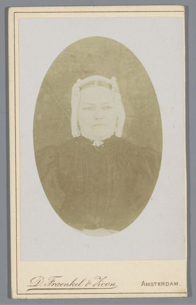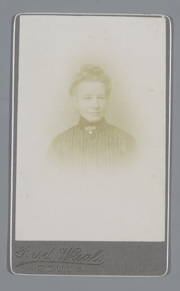 Curator: Here, we have "Portret van een onbekende vrouw", a gelatin-silver print, sometime between 1860 and 1896, attributed to Dechamps et Cie. Editor: There's a haunting quality to this image, isn't there? A gentle sadness emanates from the woman's eyes. She looks… distant, somehow. Curator: The tonality definitely contributes. Observe how the limited grayscale palette renders a sense of age and timelessness. The framing too, with its almost vignette-like soft focus, directs our gaze to her face. Editor: I wonder what she was thinking at the moment this photograph was taken. What were her hopes, her fears? It’s frustrating that her story is lost to time, isn’t it? I see strength too, despite that initial melancholic vibe, it feels deeply human. Curator: Indeed. It prompts reflection on the lives of ordinary people, those whose faces we might otherwise never encounter. The careful pose and attire suggest a deliberate presentation of self, perhaps a commission. Editor: Right. Imagine her sitting there stiffly, trying to look her best in a stuffy studio! The limitations of the photographic technology add to the story; a certain degree of patience required from the sitter! It humanizes the portrait even more. Curator: A worthwhile point. While this portrait is fairly conventional, stylistically it captures the socio-cultural conventions of the period in the formal arrangement and use of lighting to denote her place and being. Editor: So much is unsaid, so much left to our imagination, that I think "unknown" becomes "everyone." This photograph, seemingly a simple portrait, holds the weight of untold histories. Curator: Precisely. It becomes a mirror reflecting our own projections, anxieties, and fascinations with the past. The absence of specific detail transforms it into a universal reflection of the human condition. Editor: That's it exactly. Looking at her one can feel time folding over itself to remind you of shared memories, regardless of your relation to history or social status. We all dream of being known.