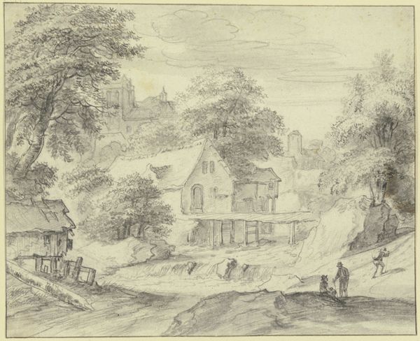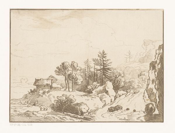 Curator: I’m struck by the way the scene feels caught between tranquility and… imminent collapse? There’s something unsettling in the architectural decay amidst this picturesque landscape. Editor: I’m pleased you picked up on that! What we’re looking at here is an etching called "Heuvellandschap met twee hutten aan het water," or "Hill Landscape with Two Huts on the Water," by Carl Friedrich Holtzmann, created sometime between 1750 and 1811. Curator: Holtzmann, yes, I know the name… that Romantic era yearning for nature and the sublime, but tinged with anxiety about its impermanence. You really get that sense here! It's not just the tumbledown shacks, it's in the shaky lines. Editor: Absolutely. His technique with the etching—the linework being quite deliberate, but also leaving space and airiness. This was a period increasingly aware of nature both as a balm and a source of tremendous, untameable power. You can see echoes of the Gothic, even. Curator: Right? Look how the artist draws the lines. The image isn’t really polished and you can see Holtzmann is prioritizing certain strokes and structures over others. How does the image itself fit into that growing public perception, though? I mean, beyond just being beautiful? Editor: That's key. These landscapes helped to create, to codify, what a properly "picturesque" scene should be—wild, but with elements of human habitation, reminding the viewer of both nature’s power and humanity’s ability to find its place within it. But, as you pointed out, there’s always this looming sense of ruin! A premonition? Curator: Possibly. There are two figures off to the side as well and in my opinion, their existence further adds to that sense of a need for this kind of exploration, especially among people removed from these areas. I can certainly appreciate the role it plays in romanticism more broadly! Editor: Indeed. Perhaps a meditation on man’s relationship with the environment as well. Something we’re still trying to sort out centuries later. Curator: Well, after looking at the details of its history, I feel that romanticism tug even more now. Thanks! Editor: You too! A fascinating little engraving that gives one quite a lot to ponder.