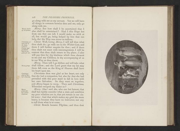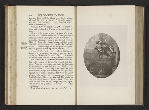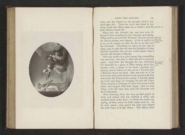 This is a photographic reproduction of an illustration by Thomas Stothard for John Bunyan's "The Pilgrim's Progress." The oval composition is immediately striking, creating a contained space for the allegorical scene. Stothard uses a monochrome palette, manipulating light and shadow to guide the eye through the scene. Note how the figures emerge from the darker, undefined areas, creating a sense of ethereal movement and depth. The artist masterfully uses line and form to evoke emotion. The upward reaching figures, combined with the soft gradations of tone, suggest a spiritual ascent. Consider how this image functions within Bunyan’s theological framework. The depicted figures represent Christian virtues, and their ascent signifies salvation. Stothard's formal choices are not merely aesthetic, but reflect the deeply ingrained religious and cultural values of the time. The visual structure of the artwork embodies the narrative's moral and spiritual trajectory.