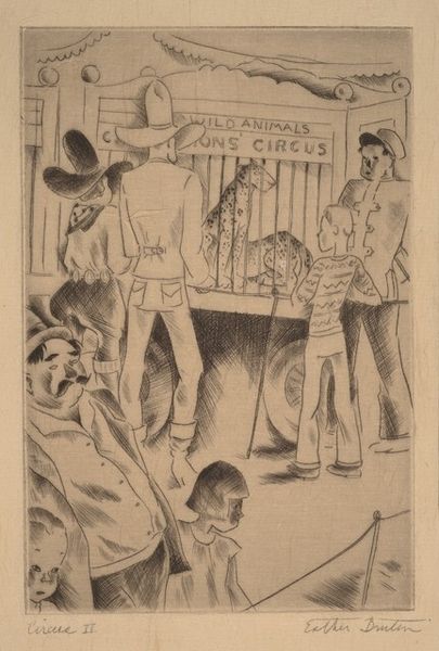 Henry Glintenkamp made this print called 'Food' with wood engraving, and it's all about the push and pull between what we see and what we think we know. I love the way Glintenkamp plays with texture. Look closely at the fire and the figures around it; there's this rough, almost primal energy there, juxtaposed against the smooth, regimented lines of the canned goods towering above. It is amazing, the contrast he achieves using just black and white! The shapes are so geometric. Are we looking at a store? Or is this an apocalyptic scene? It reminds me a bit of some of the German Expressionist woodcuts, like those by Kirchner, where the city becomes a jagged, fractured space. Art is all about conversations, right? Glintenkamp is in dialogue with those artists, but he's also saying something unique about American consumerism, and maybe even survival. It's a powerful image, and one that keeps asking questions, refusing to give easy answers.