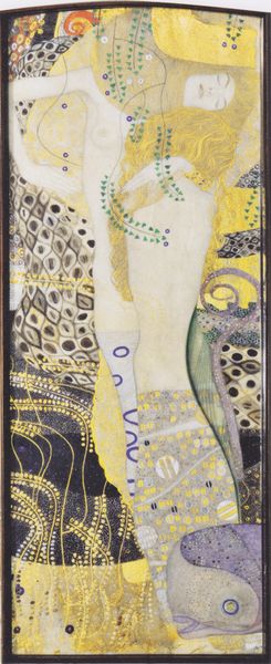 Editor: We are looking at a section of Gustav Klimt's "Beethovenfries; Die feindlichen Gewalten," or "The Hostile Powers" painted in 1901 using mixed media, including mosaic. This piece has a palpable sense of opposing forces, quite a visual feast. What structural elements strike you first? Curator: Immediately, it's the stark juxtaposition of textures. Note the smoothness of the figures on the left contrasted against the frenetic energy of the background. Klimt orchestrates this drama using a strategic deployment of pattern and line. Editor: So, it is almost a graphic representation of clashing ideals. But are there elements creating some kind of compositional unity? Curator: Precisely. Notice the echoing curvilinear forms throughout, binding the diverse elements. The serpent motif, for example, reappears subtly in various sections, creating visual harmony amidst the chaos. Consider the color palette as well: How does Klimt utilize gold to establish visual relationships? Editor: It seems to tie figures and monstrous forms. Gold appears, also, in otherwise discordant color areas. Curator: Yes, acting as a binding agent across the composition. And how might we read the vertical orientation of the canvas, segmented as it is, within a framework of contrasting energies? Editor: Well, now that you mention it, it seems that the more hostile, chaotic side weighs down more serene images with softer colorations. So, there is a hierarchical sense of spatial organization there! I’m starting to see Klimt's technique is an intentional commentary itself. Curator: Indeed. By deconstructing the visual grammar, we begin to understand how meaning is generated not only through symbolism, but through the pure act of structuring visual experience. Editor: Thanks! I hadn't considered just how significant the arrangements of forms contribute to conveying the work's intended message!