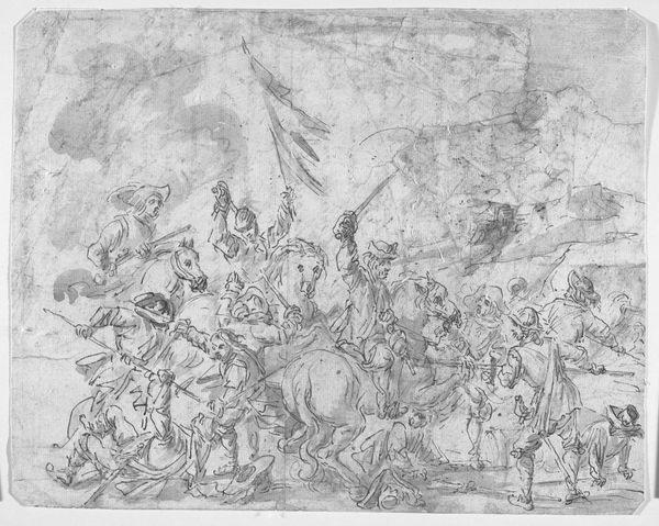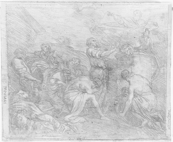 Curator: Let’s take a closer look at this Baroque drawing. It depicts "St Maurus healing the sick in France," dating from 1706 to 1709, currently held in the collection of the SMK, Statens Museum for Kunst. Editor: Wow, talk about organized chaos! At first glance, I see a scene crammed with bodies and emotion. There's so much implied movement – like a freeze-frame from a play. I'm immediately struck by the pathos – all this suffering laid bare. Curator: Indeed. Examining it through a critical lens, the piece reveals intriguing dynamics of power, faith, and social structure within the historical context. Saint Maurus's ability to heal reflects the Church's dominance. The "sick" can be understood as marginalized individuals, thus visualizing hierarchies within society at that time. Editor: It's fascinating how the artist uses line work. It feels preliminary, like a sketch, which kind of reinforces that idea of a single moment frozen in time. Are we meant to see this almost like a journalistic snapshot? The rough edges suggest a truth seeking rawness to me. Curator: Considering that these kind of scenes and figures frequently recur throughout religious and historical depictions during the Baroque era, it might also highlight certain expectations around the display of miracle and sanctity, with the sick and suffering always already an important constituent of its image building. It subtly entrenches existing orthodoxies around the representation of class and physical suffering, while it seems to promote spiritual hope. Editor: I see what you mean. Even with this implied drama, there's an undeniable artifice at play. That swarm of cherubs floating overhead are not so subtle reminders that what is portrayed here are ideological claims about divinity. But even recognizing all the socio-political implications does not take away from that initial emotive response. Looking at all this misery kinda takes your breath away. Curator: Precisely, these intersections between representation, suffering and structural violence is important when studying the canon in order to both celebrate art and advocate justice. Editor: Absolutely. And after spending time with this, it really strikes me how a simple drawing from centuries ago can open up such vast, rich conversations. I guess it is testament to the artist’s abilities and the magic of observation!