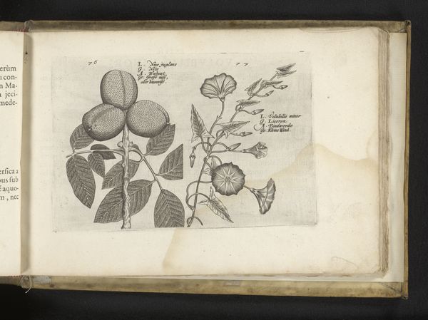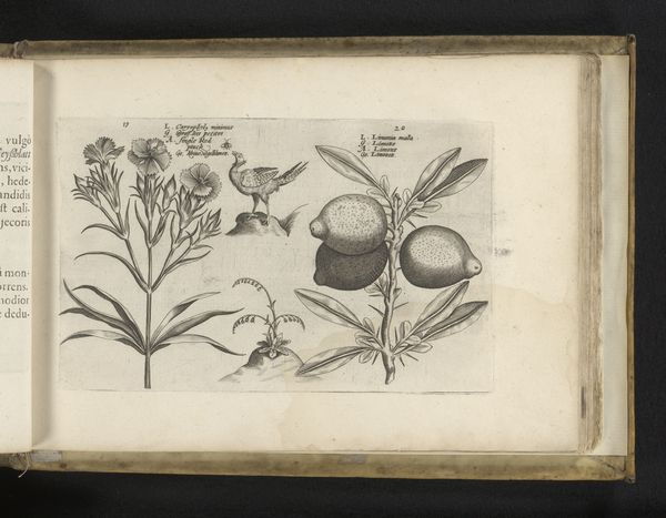 Editor: So, here we have "Vijgenboom en wilde akelei" – that’s Fig Tree and Columbine in English – by Crispijn van de Passe the Younger, from 1617. It's an engraving, isn't it lovely? It reminds me of botanical illustrations, but something about the composition feels a little…symbolic. What do you see in this piece, from an iconographic point of view? Curator: I'm drawn to the pairing itself. The fig, laden with fruit, often represents prosperity, abundance, even a certain carnal knowledge. The columbine, in contrast, with its nodding head, is frequently associated with humility, sorrow, and remembrance. They evoke very different cultural memories, don't they? Editor: Absolutely. The fig does have a sensuous, almost overflowing quality. And the columbine, drooping... It’s a strong contrast. Was this juxtaposition a common one at the time? Curator: Not necessarily, but the 17th century mind delighted in such layered meanings. Consider that flowers were sometimes given as coded messages; this image reads almost like a visual poem. The 'memento mori' was popular, where emblems would provoke mortality. The hummingbird hints that something small will take this image further. Editor: So, not just a pretty picture, but a contemplation on the transient nature of pleasure versus enduring qualities like humility? I never would have gotten that from just looking at it! Curator: Precisely. And remember, art always speaks within a specific cultural context. Images accrue symbolic meaning over time; these humble plants hold centuries of unspoken understanding. Editor: That's amazing. It changes how I see even seemingly simple images. Thanks so much! Curator: My pleasure! It is through uncovering these hidden depths that we truly engage with the art of the past, ensuring its lasting presence.