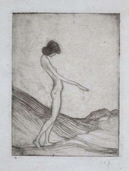 Curator: Anders Zorn's 1910 etching, "Seaweed," held at The Art Institute of Chicago, depicts a nude woman wading in shallow water, holding what appears to be strands of seaweed. Editor: It strikes me immediately as incredibly tactile despite being a print. I’m drawn to the visible mark-making; the sheer labour involved in the etching process becomes apparent under scrutiny. Curator: Zorn often depicted women in nature. Water, especially, had symbolic significance relating to cleansing, sensuality, and the primordial feminine. The seaweed she holds can be seen as a connection to the earth's vital forces, suggesting a return to a more natural state. It could reference classical portrayals of Venus. Editor: It's interesting how he creates a sense of depth with so few lines. The economy of mark-making is deliberate – the density of lines indicating the water’s ripples and shadows, the woman rendered with just enough detail to capture the light on her body. I wonder what kind of mordant he used for the etching, to achieve this degree of tonality? Curator: In that period, prints democratized art, making images accessible across society. The depiction of the female nude in natural environments speaks to long traditions of associating women with the bounty and mysteries of the land and sea. Do you think it reflects a societal desire to reconnect with nature amid increasing industrialization? Editor: Absolutely. The means of distribution also contributed to its resonance. To mass-produce something that captures a sensual, yet rustic and idyllic, scene certainly would appeal to a broader market dealing with modernity's alienation and massification. Curator: Examining this piece reminds us of the enduring human connection to nature's cycles. Editor: It reminds us to appreciate not only the subject, but the material and process that brings us to the subject.