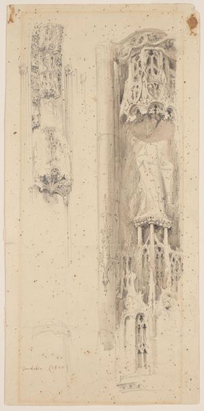 Curator: This is John Ruskin's "Architectural Sketch, Venice," currently held at the Harvard Art Museums. Editor: Immediately, I'm drawn to the sketch’s somber mood and the suggestive nature of the materials, which feels unfinished yet powerful. Curator: Indeed, the medium, likely watercolor and graphite, lends itself to this sense of transience. Note the architectural details—the columns, the suggestion of arches—Ruskin masterfully uses line and wash to evoke depth. Editor: I'm more interested in the process—Ruskin, the craftsman, capturing Venice not as a static monument but as a place of labor, constructed by human hands using available materials. Curator: But consider the composition! The columns aren't merely structural; they create a visual rhythm, guiding the eye upward. The absence of human figures further accentuates the architectural forms. Editor: To me, it raises the question of accessibility. Who built these structures, and for whom were they intended? The drawing hints at the social stratification embedded in Venetian architecture. Curator: A valuable point. The interplay of light and shadow does create a theatrical effect, almost as if staging social dynamics. Editor: Exactly, it is not just about aesthetic beauty. It's about the labor and materials that shaped the built environment. Curator: The sketch invites us to consider Venice beyond its picturesque facade, revealing its complex visual language. Editor: And to reflect on the hands that raised its stones, giving form to a watery world.