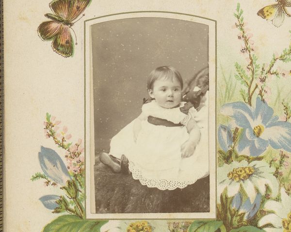 Editor: We are looking at "Portret van een kind", dating from somewhere between 1860 and 1900, attributed to Wellsted & Son. It appears to be an albumen print. The sweetness of the child and floral decoration create such a delicate contrast with the monochrome image in the oval frame. How do you approach a piece like this? Curator: The interplay between form and surface is immediately apparent. Observe how the albumen print renders the child’s dress; the textures, and minute details come forward. Then compare this central form, enclosed within the oval, to the applied watercolor floral design which pushes it forward. Do you perceive a spatial disjunction created by the stark contrast in materiality and form? Editor: Absolutely. The hyperrealism of the photographic portrait versus the whimsical, two-dimensional flowers surrounding it create a very particular feel. Almost dreamlike. Curator: Precisely. The flatness of the floral design, especially, acts as a framing device which heightens the illusionism of the photographic detail. Notice the delicate, almost imperceptible tonalities achieved through the albumen process. How do these grayscale values influence the legibility of form in comparison to the colors of the surrounding floral? Editor: The subtlety of the grayscale forces my eye to linger on the details of the child's face, creating a sense of intimacy. It becomes the undeniable focal point of the composition. Curator: A successful manipulation of materials to guide the viewer's gaze. The combination of the photographic, the decorative, results in an interesting visual tension between artifice and verisimilitude. Editor: I see it now. Paying close attention to materiality has totally changed my perception of this image! Curator: Indeed. And appreciating how different forms interact adds new richness.