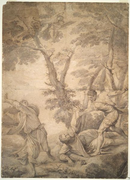 Editor: This etching by Salvator Rosa depicts the Finding of Oedipus. It's incredibly detailed. What strikes me is the dense forest setting; it feels almost theatrical. How do you interpret this work within its historical context? Curator: Salvator Rosa, active in 17th-century Italy, often explored themes of the sublime and the dramatic. Here, Rosa engages with the classical narrative of Oedipus, placing it within a wild, untamed landscape. Consider how this contrasts with the more ordered landscapes favored by other artists of the period. What could that suggest about the public role of art during that time? Editor: Maybe Rosa is commenting on the unpredictable nature of fate, contrasting human drama with the indifference of nature? Curator: Precisely. And how might the use of etching, a printmaking technique allowing for wide distribution, influence the reception and political implications of the imagery? Editor: I hadn't thought about the political implications of printmaking itself. Curator: Rosa uses his art to engage in social commentary, highlighting themes of fate and power through accessible imagery. Editor: This really highlights how artistic choices can transform even classical tales into powerful statements.