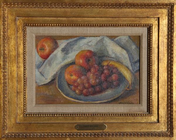 Małgorzata Serwatka painted this still life, without a glass, with oil. Still lifes are often associated with the Dutch Golden Age, a time of economic prosperity that saw an increased interest in detailed depictions of everyday objects. Here, the choice of fruit and flowers, arranged carefully on a draped table, evokes a sense of abundance. The use of oil paint allows for rich colors and textures, drawing the viewer's eye to the tactile qualities of the fruit. There is a contrast between traditional still life painting and Poland's transformation in the late 20th century, marked by political and social change. It makes you wonder whether artists were returning to the tradition as a means of connecting with the past. To fully understand it, one would need to research Polish art history. A good starting place might be museum archives or academic journals specializing in Eastern European art. Only then can the viewer fully understand the context.