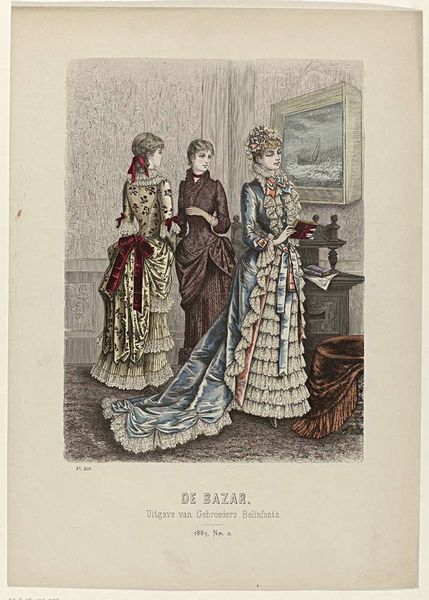 This print, from an unknown hand in 1883, shows three women in high fashion dresses. The medium is lithography, a newly industrialized printing process that used the chemical repulsion of oil and water to transfer an image from stone to paper. It's important to note that this print itself was a product of mass manufacture, intended for wide circulation. Look at the gowns, how they emphasize the elaborate, ornamented, and highly structured silhouettes of the period. These dresses, while beautiful, were only possible through the exploitation of garment workers. The availability of printed images like this, in turn, fuelled consumer desire for the latest styles, creating a feedback loop of production and consumption. The textile and garment industries relied on both technological innovation and also labor to meet the demands of fashion. By considering the material conditions of its production, we can see how this seemingly innocent image is tied to wider social issues of labor, politics, and consumption, challenging traditional distinctions between art and craft.