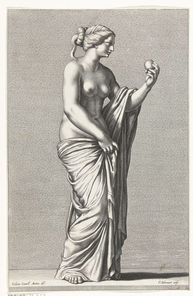 This print, titled "Smaak" or "Tasting," was created by Alexander van Haecken in the 18th century using a mezzotint technique. This printmaking process involves roughening a copper plate with a tool called a rocker, then smoothing areas to create lighter tones. The velvety texture and subtle gradations of light and shadow achievable through mezzotint lend themselves well to depicting skin and fabric. It's a labour-intensive process, demanding skill and precision. The softness of the medium gives this print the look of a chalk drawing. This one is a study in the sensuous—the textures of the skin and cloth, and especially, the implied taste of the fruit that the figure holds to her lips. Mezzotint was often used for reproducing paintings, making art accessible to a wider audience, and this print shows how a handmade process could participate in the developing culture of mass production and consumption. The image thus belongs to two worlds at once: the rarified realm of fine art, and the more down-to-earth world of getting and spending.