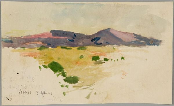 Editor: Robert David Gauley’s watercolor, Landscape, Aegina, Greece, is quite striking. The washes of blues and greens create such a hazy atmosphere. What formal elements stand out to you? Curator: The composition is remarkably flattened, wouldn't you agree? The artist employs a limited palette, focusing instead on tonal variations to suggest depth and distance. Note how the layering of washes builds a sense of atmospheric perspective. Editor: It’s interesting that you see flattening. I felt drawn in by the gradations of color. I’m starting to see how those gradations also flatten the view, though. Curator: Precisely. The artist uses color as a structural element, rather than for representational accuracy. It’s in the formal restraint that its power resides. Editor: I see that now. Thanks for highlighting the structural use of color! Curator: My pleasure. It’s a work that rewards close attention to its formal qualities.
