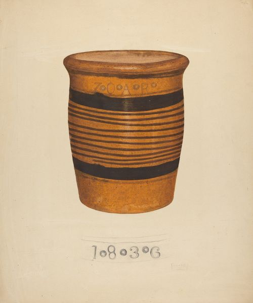 Curator: Before us is Anne Mentzoff's "Inkwell," a drawing made with pencil, watercolor, and charcoal on paper, created sometime between 1935 and 1942. Editor: There's an air of quiet introspection about it, wouldn’t you say? The object, precisely rendered as it is, feels heavy with symbolic weight. The textures of the inkwell are remarkably vivid. Curator: Absolutely. The meticulous rendering draws attention to the formal qualities of the work. Note the deliberate geometric patterning across the inkwell's surface—the cross-hatching against the concentric circles creates a striking visual tension. The artist’s employment of varied media is compelling. The strategic addition of subtle colors emphasizes dimensionality in its geometric structure. Editor: The context of its creation during the interwar period adds another layer of meaning, of course. Given the social and political unrest of the time, I’m prompted to consider if the subject represents an object of stability or nostalgia. This focus on such a commonplace tool asks us to pause and appreciate what may have been otherwise ignored at this time. The ability to disseminate through writing becomes all the more meaningful, too. Curator: An intriguing perspective. I see a formal exercise that is evocative because of the textures that make the object feel both substantial and yet also immaterial, even illusory. The use of charcoal imbues the piece with a distinct tonality, generating stark contrasts within a fairly constrained tonal range. The cylindrical object stands apart against the muted expanse of paper. The visual result is striking. Editor: For me, this evokes a sense of personal history and narrative embedded within everyday life, made all the more evocative by the turbulent interwar years. Curator: Ultimately, the work invites multiple readings of the ordinary that illuminate distinct interpretive viewpoints, demonstrating the efficacy of its formal strategies. Editor: I'm struck by how a humble inkwell, filtered through the artist's hand, resonates with so many implications of her social and cultural place in history.