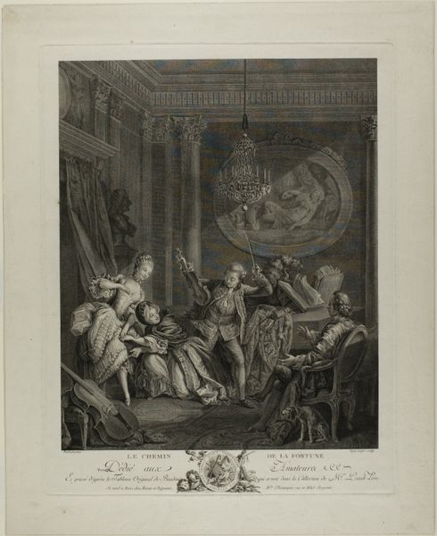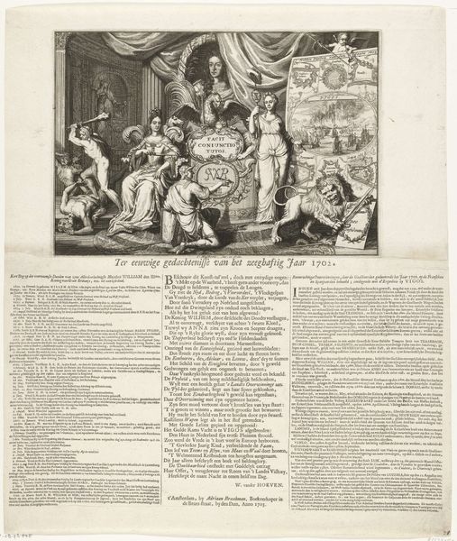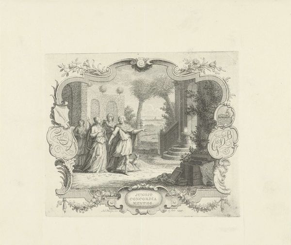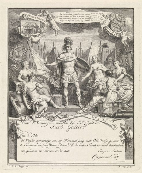 Curator: Right, let’s have a look at this intaglio print from 1708, titled "Allegorical Representation of the Agreement between Religion and Philosophy, or Faith and Reason." It's attributed to Bernard Picart and is part of the Rijksmuseum collection. Quite a mouthful, isn’t it? Editor: It's striking. A world built on precision, those sharp lines meticulously mapping out these classical figures. Very formal, very staged, as though an entire drama is unfolding on a carefully curated set. Almost theatrical. Curator: Exactly! That Baroque drama. Picart was brilliant at capturing the spirit of the age. The composition itself is an allegory; the central figures of Religion and Philosophy extending hands symbolize, as the title suggests, an agreement. See how he uses light and shadow? Editor: It does give a sense of... integration. Look at how he deploys gestures. Pointing, guiding, blessing. Are they supposed to lead us through a complex argument? Religion presents as an older woman, doesn't she? And Philosophy looks younger? I read a story of progress somehow... Curator: It is thought-provoking, the age difference is also suggestive, right? It seems to mirror, perhaps, an academic point being argued: does Philosophy builds upon foundations that Religion already put into place? And, there are historical precedents to interpreting religion this way. Remember the Middle Ages' emphasis on reconciling Aristotelian logic with Christian faith. I love the symbols sprinkled throughout, from books of knowledge to heavenly representations. Editor: Symbols on symbols. A field day for semioticians, clearly. But thinking about cultural memory and the way images shape our perception... I wonder how people during the Enlightenment received this. The script right under the images. Was it common to address a general audience in this visual-verbal way? Curator: It was. Printmaking had that potential, after all, to spread and democratize ideas at an incredible speed! Think of how images became intertwined with text, forming a visual-literary language all its own, and becoming tools for social commentary. This particular artwork aimed, likely, to legitimize both faith and reason within a period rife with intellectual and religious tension. Editor: Hmmm... Makes me think about those periods in our present, where different views clash. An artifact doesn’t always stay in its original temporal place, after all. It’s here, in our time too. Curator: Precisely. And that is the wonder, isn't it? Art continues to converse. To teach. Even challenge, depending on who's watching.