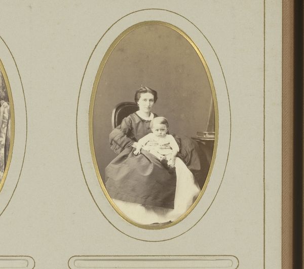 Editor: So, this photograph is titled "Portret van grootmoeder met kind," dating from between 1860 and 1880. It's a poignant image, and it makes me think about how we capture family memories across generations. How do you interpret this work? Curator: The photographic medium itself speaks volumes. The sitter’s pose, the slightly blurred edges, and the sepia tones—all contribute to a powerful image embedded with cultural memory. It’s not just a grandmother and child; it’s an archive of tenderness, familial duty, and even mortality, given the historical context. Do you notice how the grandmother’s striped dress contrasts with the child’s soft clothing? Editor: I do, actually. Is there a significance to that contrast? Curator: Absolutely. The stripes could symbolize her role and social expectations. This juxtaposition with the baby in white underscores generational hopes and pure innocence. Think about how artists, consciously or unconsciously, loaded clothing with meaning throughout history. What emotional impression do you get? Editor: A sense of love, definitely. But also, a hint of solemnity, maybe from their serious expressions and somewhat rigid pose? It seems almost formal. Curator: Precisely. It speaks to the weight attached to portraiture during that era, capturing a specific moment and preserving a familial narrative. The careful arrangement, the lighting – everything feels carefully considered to convey their relationship. Editor: I see what you mean. I didn’t think about the formality and historical intent initially. Thank you; I appreciate your reading! Curator: Of course! I learned by seeing things through your eyes as well, observing that you quickly appreciated the human element embedded within the cultural symbolism.