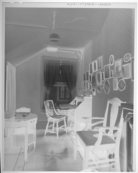 Editor: This is an untitled photograph of a seated man and standing woman by Jack Gould. It's small, only a few inches, but the scene feels rather large. I am curious about the relationship of the figures to each other. What are your thoughts? Curator: It's like a dream, isn't it? The light, that wallpaper... Almost theatrical. Do you think she's a dancer? Or maybe just playing? The man looks grounded, almost weary. A captured moment of domestic whimsy, perhaps? Editor: I see what you mean about the domestic whimsy, it's very present here. Curator: These quiet moments, these slices of life, they speak volumes, don't they? I think Gould captured more than just an image; he captured a feeling. Editor: Definitely, I agree! Thanks for your insight, I wouldn’t have seen all of that.