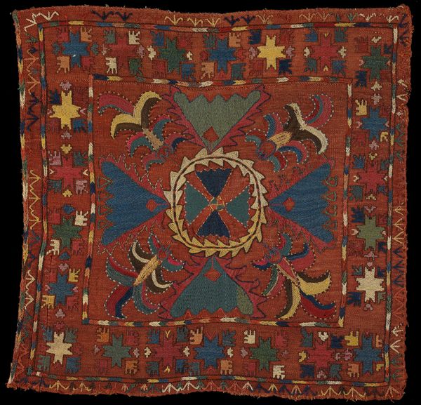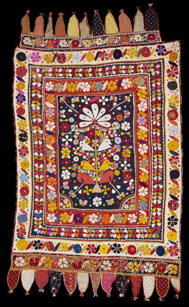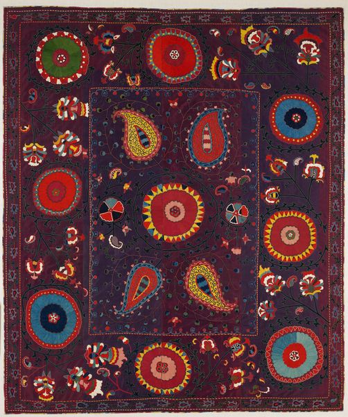 This Suzani at the Minneapolis Institute of Art presents a compelling study in textile design. The anonymous maker employed silk embroidery on a cotton ground. Notice the striking contrast between the deep indigo field and the vibrant floral motifs. The composition, with its central rectangular panel and ornate border, immediately suggests a structured, almost architectural framework. However, the organic forms of the floral patterns introduce a dynamic tension, disrupting any sense of rigid symmetry. Each blossom and vine is rendered with a deliberate crudeness, lending the work a powerful, tactile presence. This combination of rigid structure and organic design can be understood through the lens of semiotics. The indigo field can be seen as a signifier of cultural depth and history, while the floral motifs act as visual metaphors for life and fertility. Ultimately, this Suzani invites us to reflect on how traditional forms can carry complex layers of meaning. It's a beautiful piece but also an intricate articulation of cultural and philosophical values.