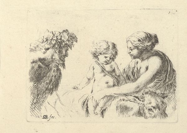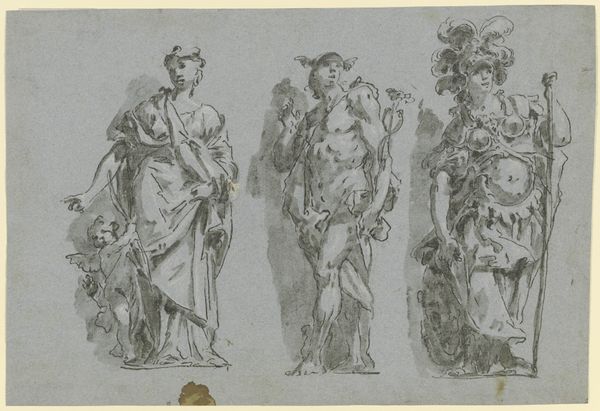 Curator: This intriguing drawing is by Isidore Pils, created around 1808. The title, "Sheet of Sketches for a Monument to Dante (recto); Cupid and Psyche (verso)", suggests a duality of intention. What are your initial thoughts? Editor: A striking impression of classical aspiration struggling to emerge! The use of graphite and ink on paper gives it an almost ghostly quality. There's something very physical about these lines—they feel almost violently applied in places, contrasting with the idealized forms being depicted. Curator: The "Dante" sketches, presumably for a monument honoring the poet, showcase a revival of interest in classical ideals, evident in the female figures that remind me of allegorical sculptures, frozen but ready to express. Note their stoic postures. Editor: Absolutely. The medium, though, makes me consider the economics of artistic production. Drawing, compared to sculpture, is readily accessible; graphite and paper would've been considerably less expensive than marble and chisels. Does the sketch’s medium reveal its own temporality? Curator: I see what you mean; this wasn't meant as the final product. The Cupid and Psyche subject on the reverse also contributes to this revival, speaking to love, desire, the soul—everlasting themes. And yet, these rapid, sketchy forms offer only a fragmented grasp of timeless ideals. Editor: Fragmented indeed. There's a tension between the monumentality they seek and the ephemerality of the sketches themselves. This paper wasn't primed or prepped; its existence is a means to an end, which raises interesting questions about what society values: the initial spark or its materialized end result. Curator: I wonder if this speaks to the period. Society still valued the end result. Still, it gives us the means to trace these concepts across cultures, revealing something fundamentally constant about human desire. What’s more enduring than a story retold through generations? Editor: Or, put differently, these very modest material conditions are necessary for grandiose expressions, a crucial counterweight. Thank you. Curator: An illuminating juxtaposition. A pleasure as always.