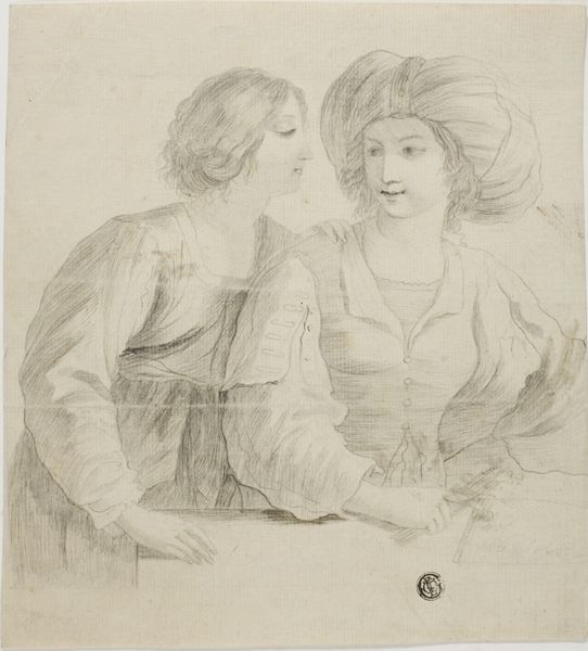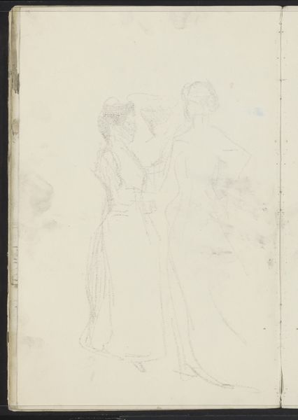 Curator: This is "Twee vrouwen die elkaars hand vasthouden, naar klassiek voorbeeld," or "Two Women Holding Hands, after a Classical Example." This pencil drawing dates from sometime between 1816 and 1852. Editor: Hmm, it feels like a whispered secret. Very intimate, the way they’re holding hands, almost tentative, in those flowing classical dresses. Is it just me, or is there a faint aura of sadness to it? Curator: I think that feeling stems from the neoclassical style it emulates. This period often invoked idealized, serene figures to convey moral virtue, but beneath that facade, there could be anxieties around social and personal expectations, particularly for women. Their intertwined hands become more complex within this lens. Editor: Anxieties? Tell me more! It's like they're not only physically supporting each other, but also sharing an unspoken burden... or a dream? I almost feel a connection with them. Are they lovers, sisters, confidantes? Curator: The possibilities are definitely intriguing. The artist, jonkvrouw Elisabeth Kemper, positions them with similar features and attire, referencing classical sculptures where form emphasized universal ideals. But this also emphasizes a potentially subversive intimacy that resists simple definition in relation to intersectional aspects of gender and relationships. Editor: See, their clasped hands—it's more than just formality, there’s strength, like a silent pact. Is that me, being oversensitive? Maybe my yearning for emotional connections speaks through what I’m viewing? Curator: It's not being oversensitive at all. Feminist theory helps us question the historical erasures and heteronormative assumptions about female relationships. Kemper’s artistic choice possibly complicates and enriches notions of companionship, love, and resistance in her own era. Editor: What do you mean? Curator: Well, imagine navigating social constraints as a woman during that time. Depicting a supportive, tender bond might subtly challenge those rigid expectations and speak volumes to women of the period who felt marginalized by dominant norms. It also suggests that in shared contact there is mutual dependence. Editor: Wow, I can't look at those hands the same way again. What initially struck me as serene intimacy has become a symbol of quiet strength and solidarity. I came for the aesthetic, but I'm staying for the story, that subtle whisper of defiance across time. Curator: Precisely. Examining art through the prisms of gender and history expands our understanding. Now, our classical figures, once symbols of cold perfection, offer nuanced narratives of resilience.