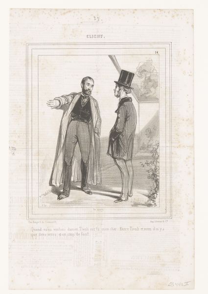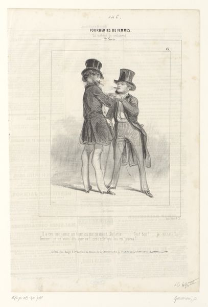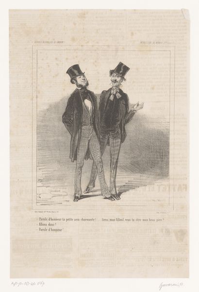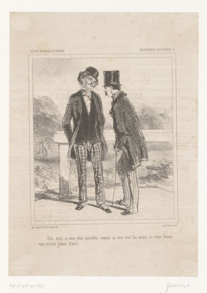 Curator: This lithograph is by Paul Gavarni, a piece titled "Twee oudere mannen kijken op hun neus," or "Two Older Men Looking Down Their Noses," dating back to 1843. It's currently held here at the Rijksmuseum. The medium, a combination of pen and lithography, offers a glimpse into 19th-century Parisian life. What's your first impression? Editor: Starkly amusing. There's an undeniable air of satire, especially in the way these two men are presented. I'm immediately drawn to their haughty expressions and the rather exaggerated detailing in their attire, which seems almost like a costume. Curator: Indeed. Gavarni was well-known for his caricatures, which often lampooned the bourgeoisie of his time. Consider the social commentary at play here; the puffed-up chests, the way they’re slightly elevated in the setting; it’s all quite pointed. The text even seems to be part of the satire. Editor: Precisely! And if we look closely at their attire, specifically their hats, those become almost emblems of their self-importance. High hats atop heads held high. Curator: It’s more than mere embellishment. Those details place the men firmly within a certain echelon of Parisian society. Gavarni was interested in illustrating the rigid social hierarchies of the time. And as the print would be displayed for all to see, a democratizing act within an otherwise intensely stratified society. Editor: Looking closer, the print captures that critical tension between observation and judgment, using symbolic accessories to indicate arrogance. One wonders, though, if their ‘superiority’ might be covering some deep anxiety, their dress indicating they are perhaps 'trying too hard.' Curator: Absolutely. Gavarni expertly held up a mirror to his society, unflinchingly capturing both its follies and its hidden insecurities. It speaks volumes about the era's complex self-perception. Editor: A reminder that sometimes the loudest statements come not through what is spoken, but through the careful deployment of imagery, of symbolic cues carefully placed. And through humor. Curator: Indeed. Gavarni was a sharp observer of human nature, revealing social dynamics. Editor: Agreed. This lithograph serves as a valuable reminder of the penetrating eye of artists of the past and that even today the impact of a visual metaphor remains.