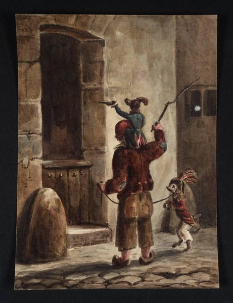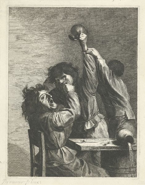 Curator: Judith Leyster's "The Last Drop," painted in 1629, presents a fascinating scene that really encapsulates Baroque aesthetics. You can find this oil on canvas masterpiece in the Philadelphia Museum of Art. What stands out to you right away? Editor: Immediately, the strong chiaroscuro. The stark contrast between the dark background and the illuminated figures draws the eye right into their hedonistic display. There's a diagonal tension, a sort of compositional struggle, created by the two figures pulling in different directions across the frame. Curator: Yes, it’s undeniably dramatic. For me, the painting is steeped in symbolic tension, a real memento mori. We see the revelers seemingly oblivious to the skeleton between them holding a skull, representing mortality. It’s a rather explicit vanitas motif, reminding us of life’s fleeting nature. Editor: Precisely. Notice the almost cartoonish skeleton in the center and then consider how that skeletal form practically echoes the draining glass and the smoker’s wisp of smoke, visually uniting those traditionally separate vanitas symbols and deepening the work’s reflective dimension. Curator: The figures' actions, too, support that transience. The man draining the bottle, the upturned hourglass… all signs pointing toward dissipation, not just of wine, but of time and life itself. Even the joyous character's clothes! The unraveling laces are as meaningful and melancholic to me as the skull between them. The revelers clearly indulge without thinking. Editor: That unrestrained nature practically leaps from the canvas, yet when analyzing Leyster's tonal work, one must pause over that deep green, somber backdrop. It acts almost as a curtain or stage flat emphasizing that there may be performance in play within "The Last Drop." Curator: A fitting note. In a society obsessed with virtue, her composition carries more significance, not just reminding us of life's brevity, but showing our place in this dance. I see something meaningful in this dramatic presentation of inevitable decay, urging consideration, contemplation. Editor: Exactly. Viewing Leyster’s visual arrangement from the Baroque era gives me so much insight, not merely into the painting but our ever-developing relationship to these time-worn themes of impermanence and joy.