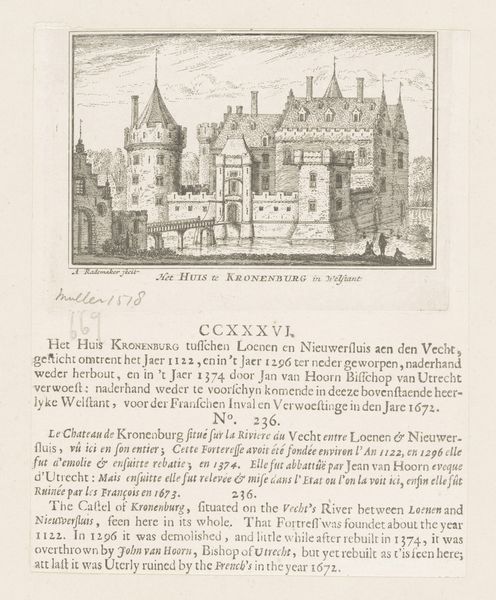 Curator: So, what are your initial thoughts on Abraham Rademaker’s “View of Rosendael Castle,” an etching from around 1725? The work is printed on paper and is currently held in the Rijksmuseum collection. Editor: Well, I'm struck by how detailed it is, especially considering it’s an etching. The artist was able to use fine line to achieve delicate precision. How can we dive deeper in interpreting this work, taking a materialist perspective? Curator: Let's consider the socioeconomic context of etching. Rademaker mass produced printed images in early modern Europe for widespread consumption by different kinds of publics. His etchings helped popularize and make accessible landscapes, castles, and other images that had previously been enjoyed and owned by a few, usually elites. How does the print medium here contribute to a dialogue about cultural heritage, democratization, or other themes? Editor: I see what you mean! By using etching, Rademaker transformed something exclusive into something more accessible. The consumption of such images moves from an individual experience to an act of collective viewing. Curator: Precisely! The act of creation and distribution itself becomes a statement, reflecting the changing dynamics of Dutch society. Is this artistic labor challenging art historical understandings of what makes this a ‘masterpiece’ or who can afford to participate in this type of cultural production? Editor: Definitely something to consider. It really shifts my perception of 18th-century Dutch landscape art. Thinking about its means of production makes me value it in a completely different way. Thanks! Curator: Glad to hear it. Examining the material conditions opens up new ways of interpreting even familiar works.