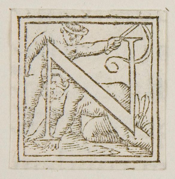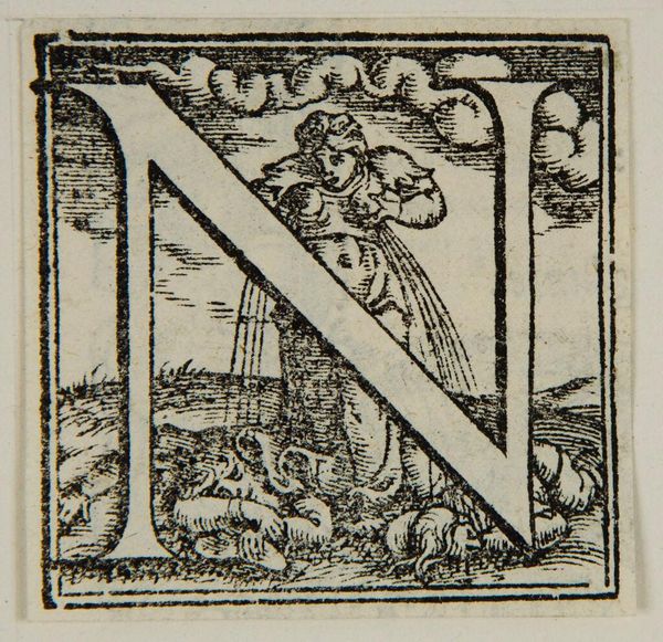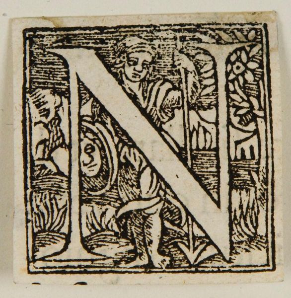 Curator: Here we have Anton Woensam von Worms' woodcut "Letter N", residing at the Harvard Art Museums. Editor: It feels so playful! The letter is nearly overwhelmed by the cherubic figure blowing a horn. Curator: Indeed, the technique allows for sharp contrasts, emphasizing the letter's form and the details of the surrounding flora. Think of the labor involved in carving away the wood to create this print! Editor: But what about that cherub? It represents a herald, perhaps announcing something important, embedded within the very structure of language itself. Curator: Or, perhaps, it speaks to the rise of printed materials and how these could incorporate more decorative, playful elements, democratizing access to art. Editor: Whether divine messenger or a sign of changing times, the symbol certainly catches the eye. Curator: It's a testament to how a simple material, wood, can convey complex social and cultural shifts. Editor: Precisely, and how Woensam's imagery continues to resonate even now.
