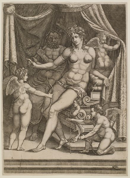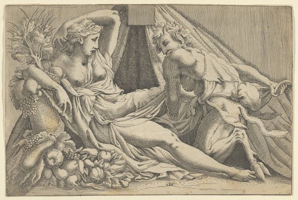 Pietro del Po created this print, “Venus Reclining on a Bed in Vulcan's Forge,” during the Baroque period. Here we see Venus, the goddess of love and beauty, in a rather unusual domestic scene. In classical mythology, Venus was married to Vulcan, the god of fire and metalworking. The story goes that Venus had an affair with Mars, the god of war. The image shows Vulcan surprising Venus and exposing her infidelity. Venus is caught in a vulnerable, almost melancholic pose while Vulcan is presented as a tradesman focused on labor. Cupid, the god of desire, assists Vulcan in his forge. Del Po's print reflects the patriarchal norms of the 17th century, where female beauty and sexuality were often juxtaposed with themes of infidelity and punishment. This piece asks us to consider how power, desire, and betrayal intersect within the private lives of gods, reflecting the complex social expectations placed upon women in Baroque society.