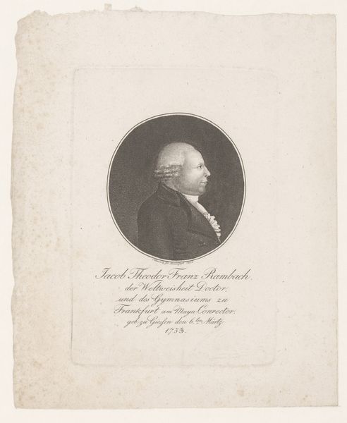 Editor: So, here we have "Portret van Jean Baptiste Joseph Delambre," a print from between 1775 and 1834, currently residing in the Rijksmuseum. The monochromatic nature of the engraving gives it a stoic, almost academic feel, doesn’t it? What do you see in this piece beyond a formal portrait? Curator: The circular frame immediately calls to mind a Roman coin or cameo. It's interesting to note how Delambre is being presented within a visual language associated with antiquity. The profile view, meticulously rendered, is meant to invoke a sense of timelessness. Can you see how his identity is being constructed through deliberate visual cues? Editor: Definitely. It's more than just a likeness; it’s about placing him within a certain intellectual lineage. I also notice the inscription beneath the portrait; could that shed some light? Curator: Indeed. The inscription identifies him as a member of the National Institute, a significant intellectual body in revolutionary France. Delambre was an astronomer, and measuring the meridian arc was critical for defining the metric system. The image connects him with that ambition. Isn't it striking how a portrait can act as a visual declaration of one's role in shaping knowledge? Editor: It's like he's being enshrined as one of the scientific heroes of the age. I’m now seeing this as not just a portrait but also an assertion of enlightenment ideals and the importance of empirical observation. Curator: Precisely! Images have long been used to anchor identities to larger cultural narratives. This engraving aimed to place Delambre, and by extension, his scientific work, within a specific context of enlightenment progress. Editor: It makes you wonder about all the hidden cultural layers beneath what initially appears to be just a straightforward portrait. Curator: Absolutely! The encoding of visual language within art encourages us to ask deeper questions.