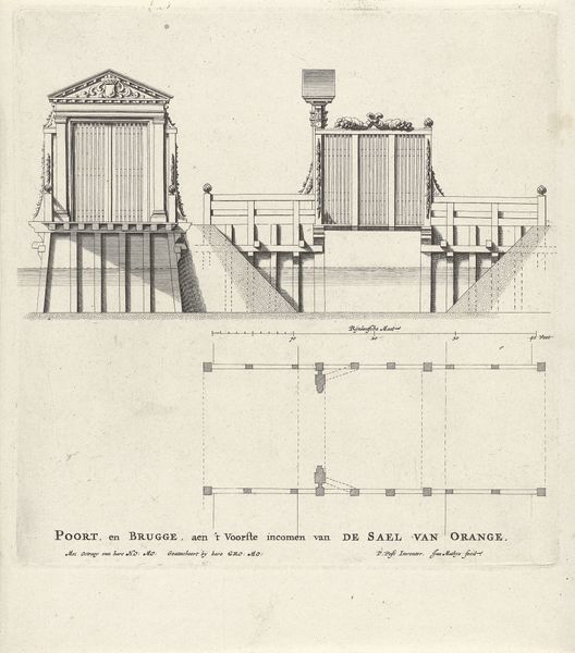 Curator: What we’re looking at is a fascinating drawing titled "Blad met twee ontwerpen voor experimentele schepen, ca. 1650"—"Sheet with two designs for experimental ships, around 1650." It appears to be from sometime between 1751 and 1753, rendered with engraving techniques. Editor: My initial thought? Utilitarian and strange! The precision of the lines against the slightly off-kilter geometric forms is oddly compelling. It gives me the sense that I am looking at the blueprints for something simultaneously functional and wildly ambitious. Curator: Absolutely. There is something so concrete and solid about rendering a concept, something that could float us, in a visual language of line and measurement. I wonder about the hand that guided the burin, and if this drawing was ever materialised into wood and canvas, what the daily life of a vessel built this way would look like? Editor: That focus on practicality strikes me too, I see not only the artistic or even just mechanical merit. Think of the intense labor involved in this rendering as an engraved piece, transferring concepts to hard matrix. The lines we are observing are not just imaginative – it speaks about economy, maritime, about its own kind of intensive human effort. Curator: You bring me back down to earth in the most poetic way. Because you're right—this sheet becomes a symbol of trade. The almost fragile and faint image it carries stands in contrast to a more brutal demand. I am pulled in by the flag; it makes me want to dream, which could not have been its function within the bigger enterprise. Editor: Exactly! And think of the materiality—the paper itself. Was it locally sourced, or another item of exchange? What dyes made the flag, and were those manufactured or found? It pushes us to understand its true purpose in a wider picture. Curator: It reminds me that art offers us an imaginative springboard—the promise to always learn new languages, so we keep reinventing the terms on which we interact with this piece. Editor: Indeed. A ship is so much more than its blueprint—it’s the wood, the rope, the bodies on board, all intertwined. And this drawing, as an artifact of a particular moment in material history, invites us to navigate those complex waters.