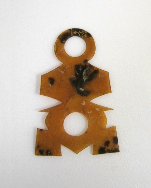 Editor: Here we have a Nose Ornament, dated from the 18th to 20th century. It's currently located here at the Minneapolis Institute of Art. Looking at the materials and form, it’s hard not to see a kind of stylized human figure in it. How do you interpret this work? Curator: Well, seeing an anthropomorphic figure in this object is perceptive. Ornamentation often embodies codified symbols linked to power and social identity, whether communicating lineage, clan affiliation, or ritual status. Have you noticed how the ornament incorporates circular and angular shapes? Editor: Yes, the circle on top and the angles forming a sort of torso shape. The repetition, or mirroring, of those shapes in the overall composition? Curator: Precisely. These geometric forms can be seen as deliberate choices to embed layers of meaning, don't you think? It invites speculation about the worldview it represented to its original owner or viewer. The shapes feel less about decoration and more about cultural memory. Perhaps the circle suggests an endless cycle. How might this object serve as a physical manifestation of invisible cultural beliefs? Editor: That makes a lot of sense. Thinking of it in this way changes the object and my appreciation, so I understand why this is here on display for all of us to see and engage with! Thanks for broadening my thinking! Curator: It's been my pleasure to share a perspective, it's so intriguing to ponder what its maker would have intended. The best art invites further questioning, don't you think?
